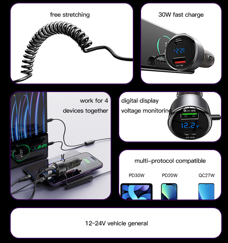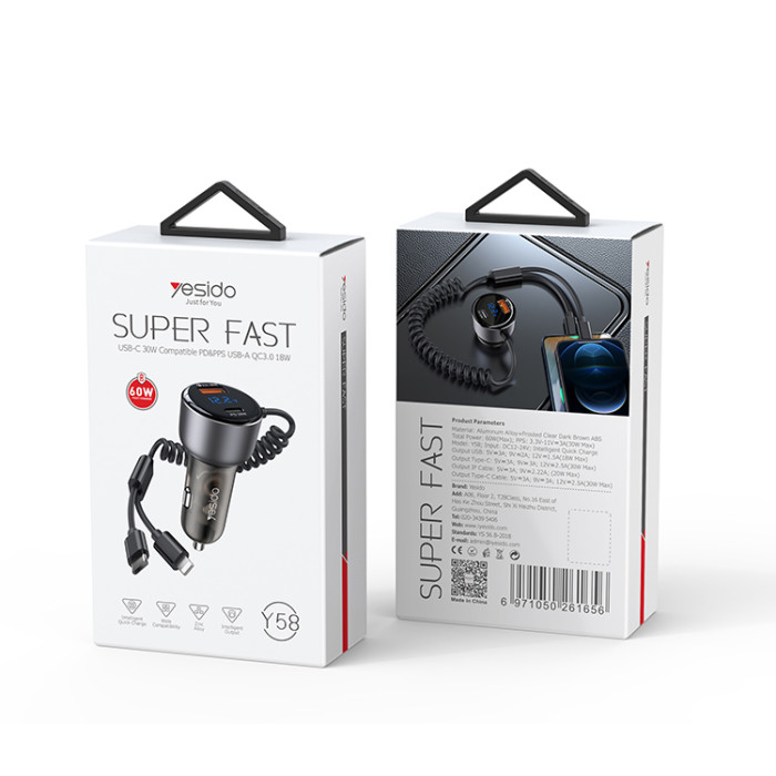 شارژر فندکی یسیدو مدل Y58 با توان خروجی ۶۰ وات، مجهز به کابل فنری داخلی، رابط‌های Type-C و Lightning، پشتیبانی از پروتکل‌های شارژ سریع QC/PD/PPS/SCP/SVP، ورودی ۱۲-۲۴ ولت خودرو و بدنه مقاوم از ABS + PC + آلیاژ روی، گزینه‌ای ایده‌آل برای شارژ سریع و ایمن موبایل، تبلت و دستگاه‌های هوشمند در خودرو.