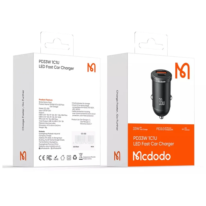 شارژر داخل ماشین مک دودو CC-232 Car Charger مجهز به انواع فناوریهای شارژ سریع PPS, PD, QC, AFC, FCP و غیره است که امکان شارژ در کوتاهترین زمان ممکن را برای شما به ارمغان میآورد. پورت Type-C با حداکثر توان خروجی ۳۳ وات به شما این امکان را میدهد تا در ۳۰ دقیقه، بتوانید گوشیهای موبایل آیفون را تا %۶۰، گوشیهای سامسونگ را تا %۶۲ و گوشیهای شیائومی را تا %۶۵ به سرعت شارژ نمایید.
