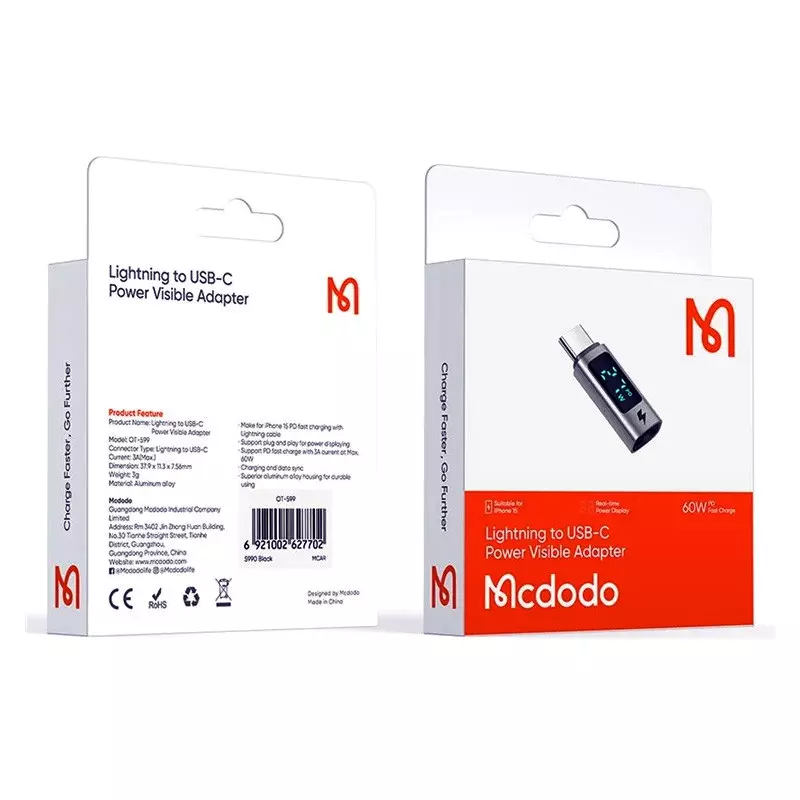 مبدل تایپ سی مک دودو به یک صفحه نمایش مجهز است که قدرت شارژ و پروتکل شارژ سریع را به نمایش می‌گذارد.