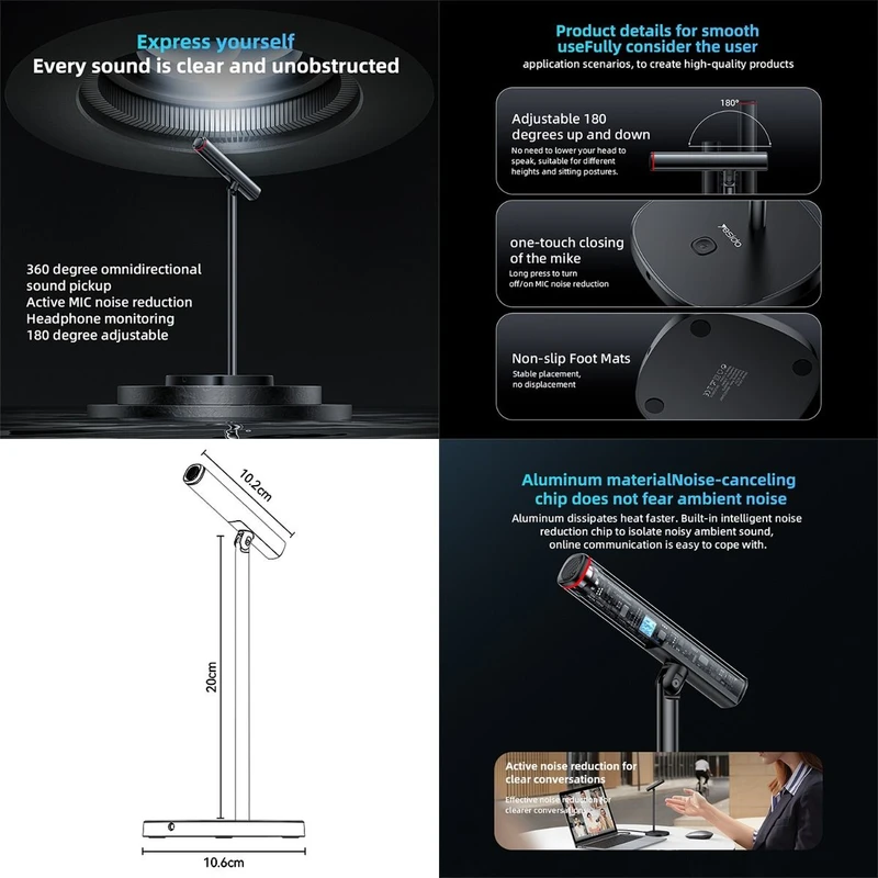میکروفون رومیزی Yesido KR18 ترکیبی از کیفیت صدای بالا، طراحی زیبا و امکانات کاربردی را در یک محصول جمعوجور ارائه میدهد. بدنه آن از آلیاژ آلومینیوم و ABS ساخته شده که دوام و سبکی را با هم به ارمغان میآورد. این میکروفون دارای الگوی ضبط صدای فرا جهتی (۳۶۰ درجه) است که امکان ضبط صدا از زوایای مختلف را فراهم میکند، مناسب برای ضبط گروهی، پادکست، کنفرانس آنلاین یا استفاده شخصی.